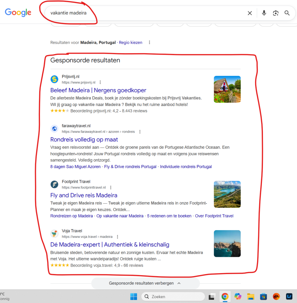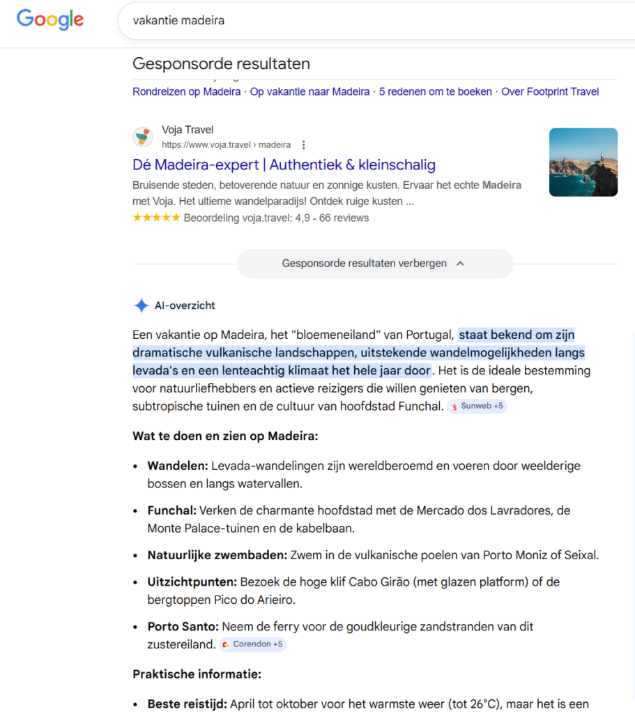Google’s search engine, once the go-to for unbiased information, has become a pay-to-play platform. The first page is now completely dominated by ads, sponsored content, and AI-generated snippets. Organic results – the ones travelers actually want – are buried on page two or three. Here’s an example for a holiday to Madeira Island – it now shows 100% ads on the first page.